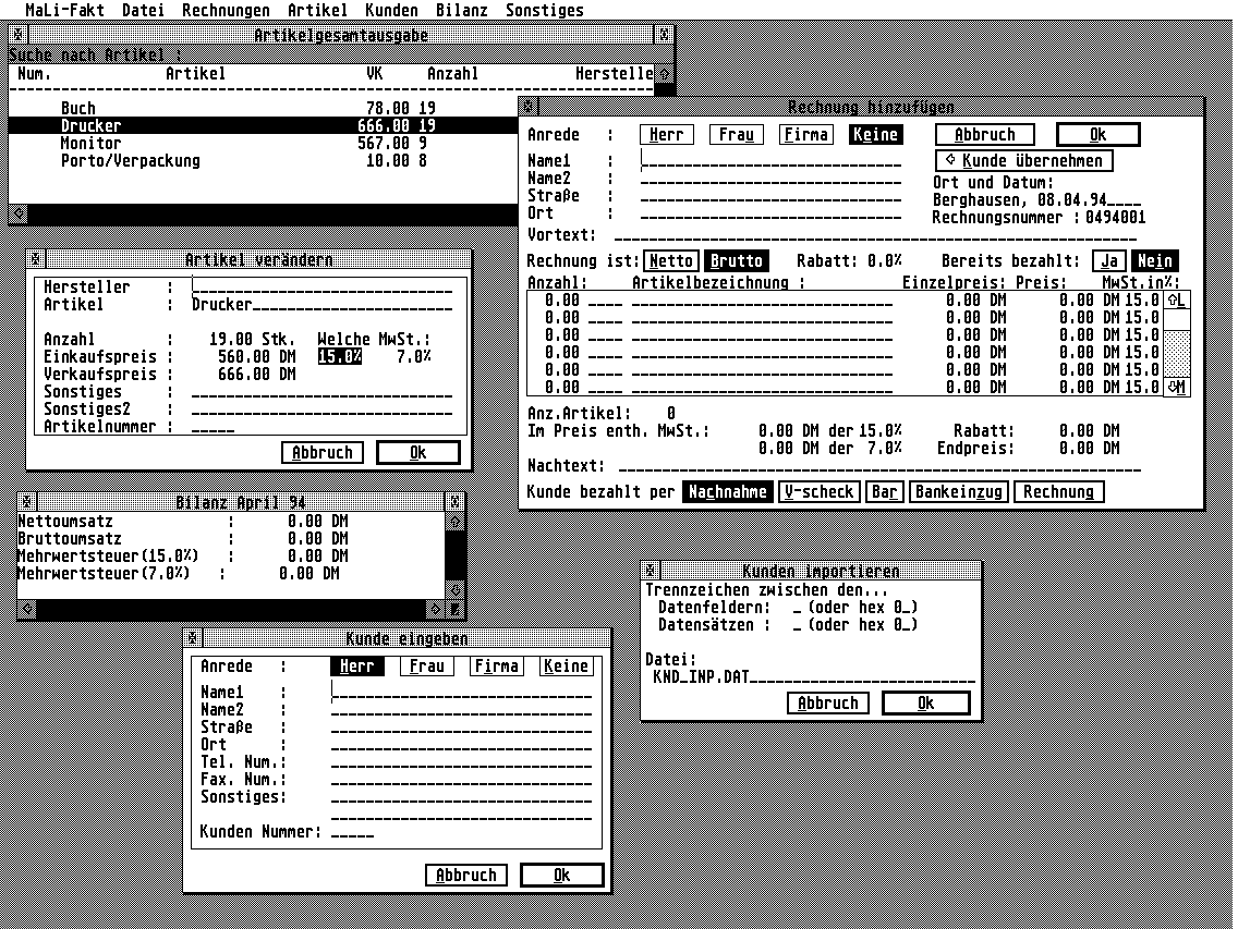 Simple invoicing program for writing invoices, delivery bills and reminders. MaLi-Fakt offers three databases containing invoices, customers and articles. Necessary things like different VAT rates, discounts are included as well as the preparation of the balance sheet for one month, quarter and year. Special versions are available for Germany, Austria and Switzerland.