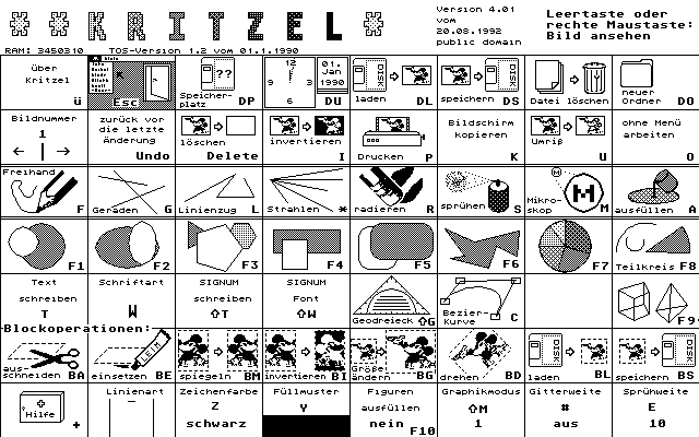 | Availability: | Floppyshop Art 0074 (Kritzel 3.60) GFA 055 (Kritzel) J 117 (Kritzel 3.9) P 2111 (Kritzel) P 2296 (Kritzel 3.92) ST-Computer PD 468 (Kritzel 3.9) ST-Computer PD 760 (Kritzel) P 2406 (Kritzel 4.01) |