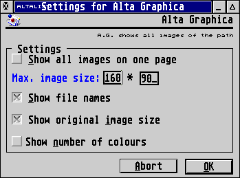 Alta Lista ist eine Bilder und HTML Datenbank für CAB. Alta Lista indexiert HTML Dateien und erstellt hieraus ein HTML Dokument, das die Dateien sortiert auflistet. Desweiteren ist Alta Lista in der Lage eine Liste von allen GIF-, JPEG- und PNG-Dateien anfertigen und sie in einer verkleinerten Version (Thumbnail) auf einer Seite anzeigen. Dies kann z.B. auch zum Archivieren von Grafik CD-Roms benutzt werden. - GT-Look II