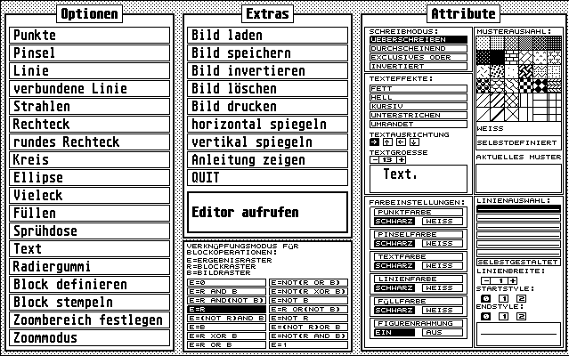 Hochauflösendes Malprogramm mit vielen Funktionen: Alle bekannten Zeichenoperationen, Block drehen, spiegeln, vergrössern, verkleinern, verbiegen. Folgende Formate können verarbeitet werden: Doodle, Degas, Profi-Painter, Neochrome, Colorstar, Art-Director (eingeb. Farb-Monochrom-Konverter). Zeichensatzeditor sowie 12 Zeichensätze werden mitgeliefert. -
