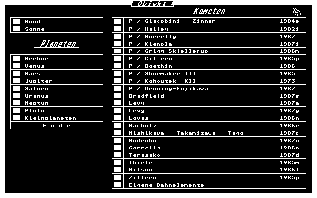 Dient dazu, nach Eingabe eines bestimmten Zeitraumes innerhalb eines Jahres die Ephemeriden verschiedener Objekte zu berechnen. Zusätzlich wird die Möglichkeit geboten, die Mond- und Sonnenfinsternisse eines Jahres zu berechnen, sowie die Konstellation der vier inneren Jupitermonde auf den Bildschirm zu plotten. Programm mit langer Sternwartenerfahrung