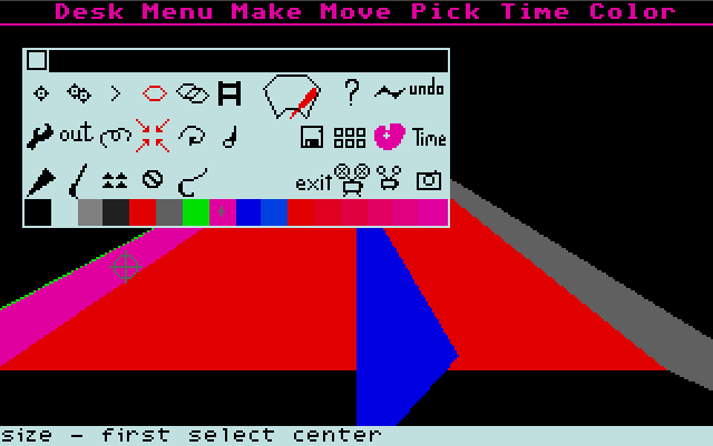 Zeichenprogramm. Erstellen bemaßter Zeichnungen bis DIN A4. Beim Aufziehen eines Rechteckes wird die Größe angezeigt, wahlweise bezogen auf Bildschirm oder Drucker. Möglichkeit, einen Kreisbogen durch zwei Punkte auf dem Kreis und den Mittelpunkt zu definieren. Füllmuster lassen sich aus dem aktuellen Bild ausschneiden und dann zum Füllen verwenden. Bereiche können invertiert werden. Mit Routine, die jedem beliebigen Objekt einen Schatten unter Verwendung des aktuellen Füllmusters gibt. Drehen, Spiegeln, Biegen und Formen von Blöcken. -