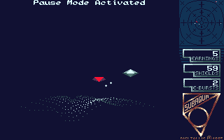 The background story to this one is a mini-novel in its own right! To sum it up, it is set in the third millenium and Yikosaka are an interplanetary trading company. They have discovered LV- 217, a planet rich in mineral resources and "real" water. In an attempt to protect their find, Yikosaka install a Space Station above LV-217. However, news leaks out and others from across the galaxy, known as freeminers, decide to cash in on the planet's mineral resources. They sneak in undetected, grab what they can and leave. Your task is to destroy them. You start off with a basic spacecraft and earn credits for each freeminer destroyed. Credits are collected when you dock with the Space Station and may be used to repair or enhance your ship. You can build up quite a powerful craft with a bit of practice, this in turn is more efficient and will earn you more cash. Apart from the trading element, Subaqua is basically a fast action shoot 'em up. It resembles David Braben's "Virus" to a certain extent and is entirely mouse controlled.